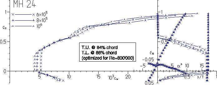 It is quite convenient, that the minimum drag of this airfoil occurs at the same transition location, nearly independent of the Reynolds number. Therefore it is possible to select a single, optimum location for the transition strip; in case of the MH 24, this is approximately at 85% of the chord.