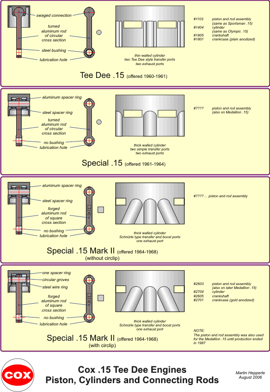 Gas transfer systems in Cox .049 engines The cylinders of these Cox engines came with three different porting systems. These differ in the arrangement and number of transfer channels. Initially these transfer channels were milled with a single milling operation, resulting in a single, wide transfer flute; cylinders could have a single or a pair of two opposing flutes. With the development of the Tee Dee and Medallion series it was discovered that the addition of one or two narrow secondary flutes would increase performance notably. Therefore these engines were equipped with either a single boost flute (the Medallion family) or two boost flutes at each edge of the basic transfer flute. Only some of the Bee family engines were equipped with such cylinders, most noticeable the Venom engine. An additional feature built into the cylinder is the height of the lower edge of the exhaust window. This edge can be machined low enough for the piston skirt to open a slot below the piston when the piston is at top dead center. This is called sub-piston induction because the engine can suck in an additional amount of air directly into the crankcase, thus bypassing the carburetor. This works only well as long as no muffler is used. A muffler would lead to the induction of exhaust gas instead of fresh air.